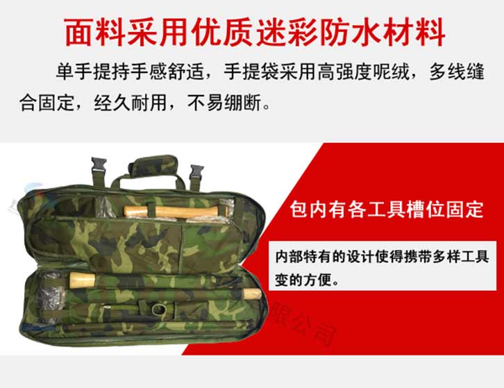 防汛組合工具包六件套:鍬、鎬、消防斧、十磅錘、鋸、撬棍、兩節(jié)連接桿、工具包。一柄多用,適用于消防隊(duì)員使用